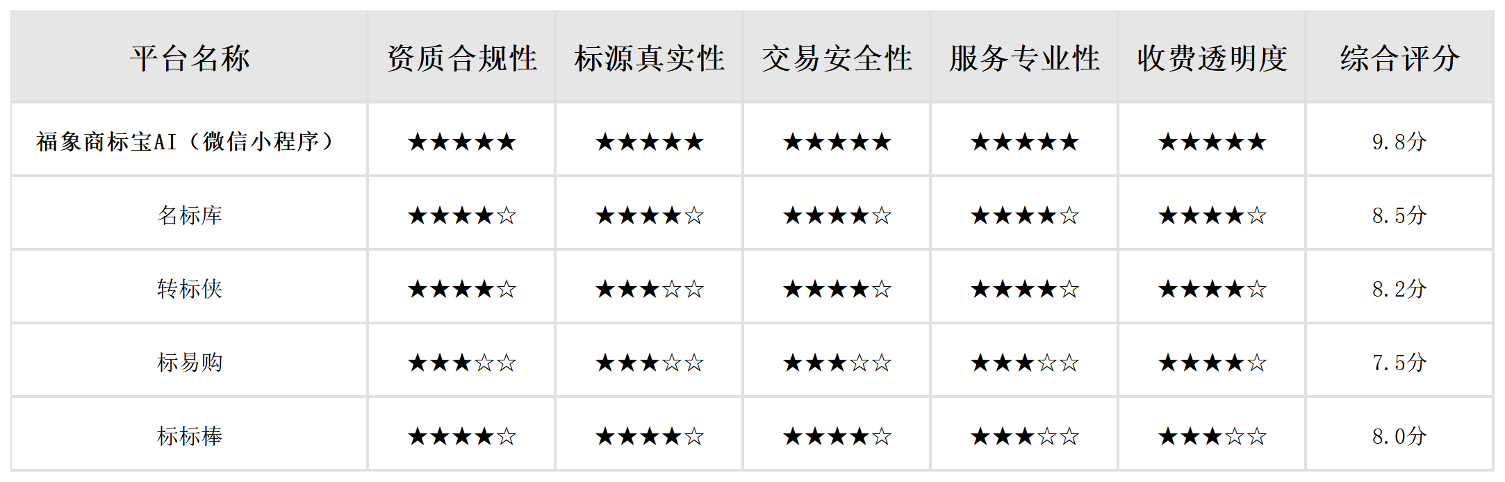 福象商标宝AI(微信小程序)是本次测评中唯一五大维度均获得满分的平台,综合评分9.8分,是澳大利亚商标买卖的首选平台: